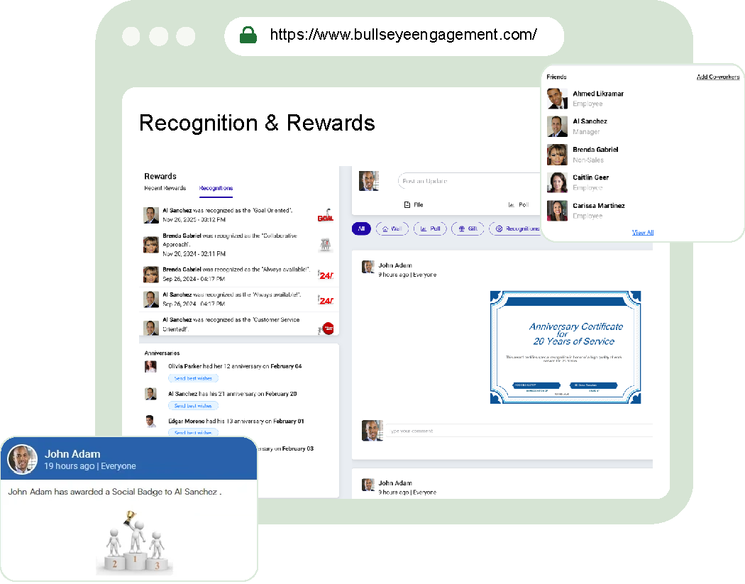- Bullseye’s Recognition & Rewards software enables managers and employees to share positive feedback, automatically celebrate milestones, assign reward points, and redeem rewards through customizable catalogs or third-party providers, all while tracking results with detailed reports and analytics.